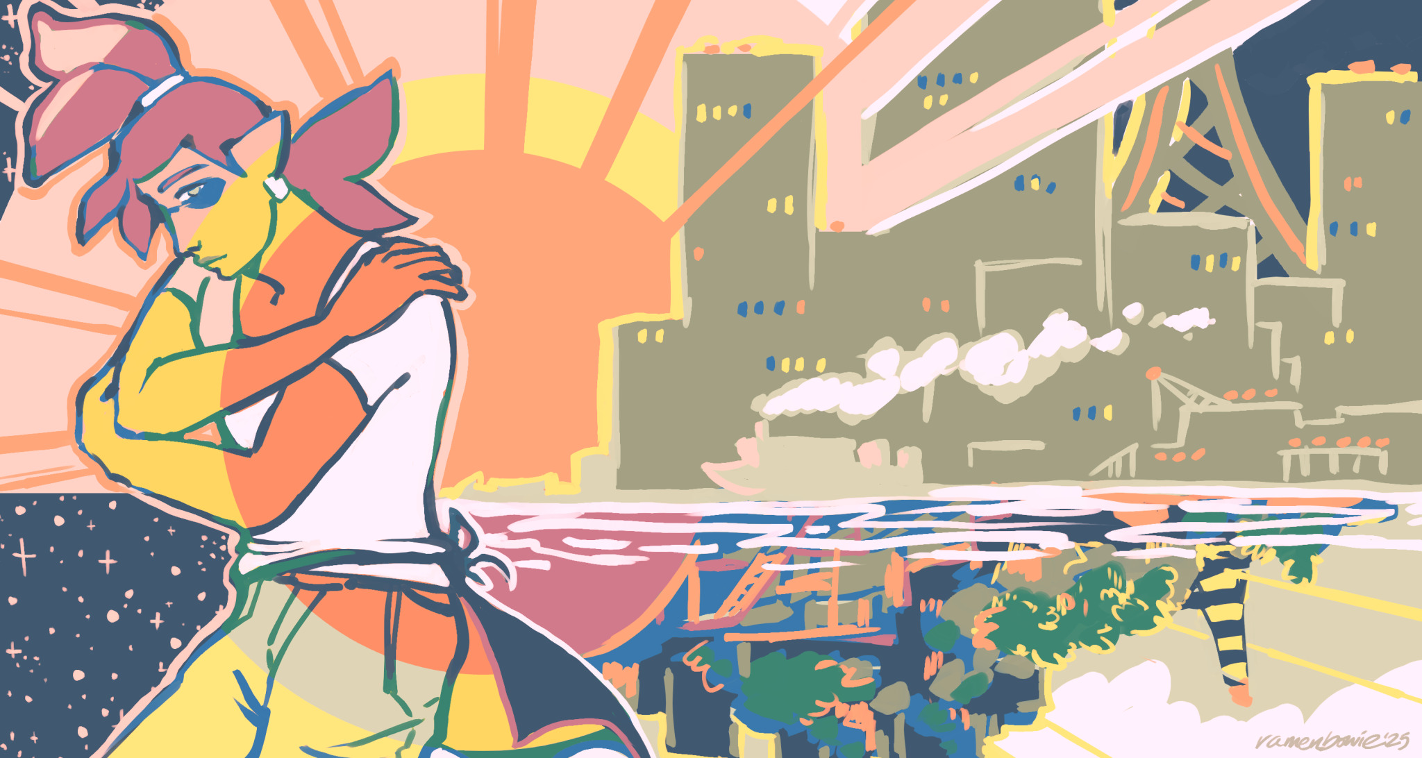 A gear shifts inside him, while he climbs back to the street level. There's a featherweight lift in the air, a subtle tranquility as everything is, at last, quiet. Periwinkle clouds and fuzzy peach gradients make a dreamy backdrop for the jet trails. Sleepy curtained windows and early lightbulb flickers dot the apartments and high rises. The city blurs the borders between rest and wake. Far beyond Inkopolis Bay, a splash of bright orange encircles the sun, which will dissolve in a hot white glow at noon. Such a difficult night can only bring a beautiful day.